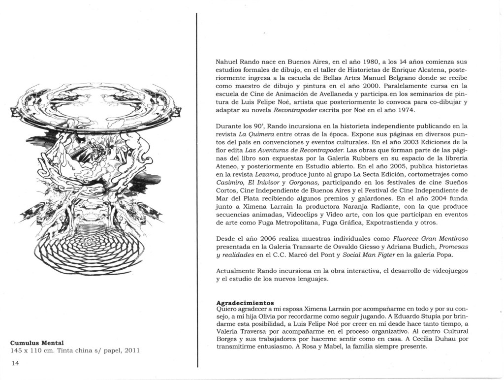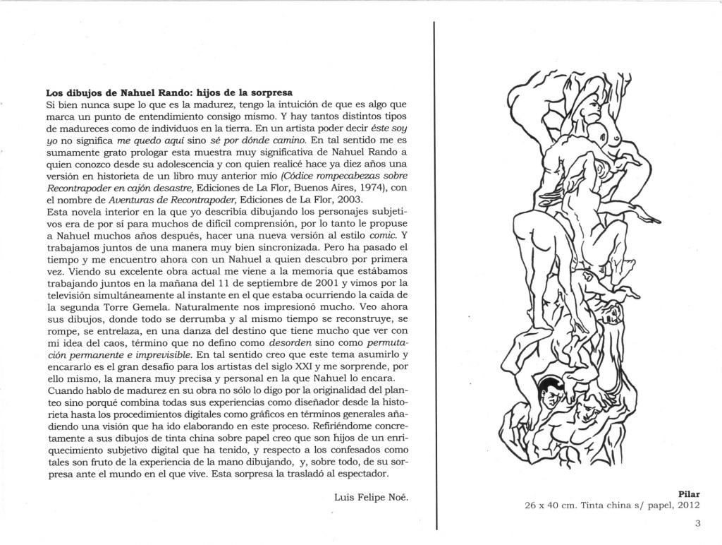 Si bien nunca supe lo que es la madurez, tengo la intuición de que es algo que marca un punto de entendimiento consigo mismo. Y hay tantos distintos tipos de madureces como de individuos en la tierra. En un artista poder decir éste soy yo no significa me quedo aquí sino sé por dónde camino. En tal sentido me es sumamente grato prologar esta muestra muy significativa de Nahuel Rando a quien conozco desde su adolescencia y con quien realicé hace ya diez años una versión historieta de un libro muy anterior mío (Códice rompecabezas sobre Recontrapoder en cajón desastre, Ediciones de La Flor, Buenos Aires, 1974), con el nombre de Aventuras de Recontrapoder, Ediciones de La Flor, 2003.