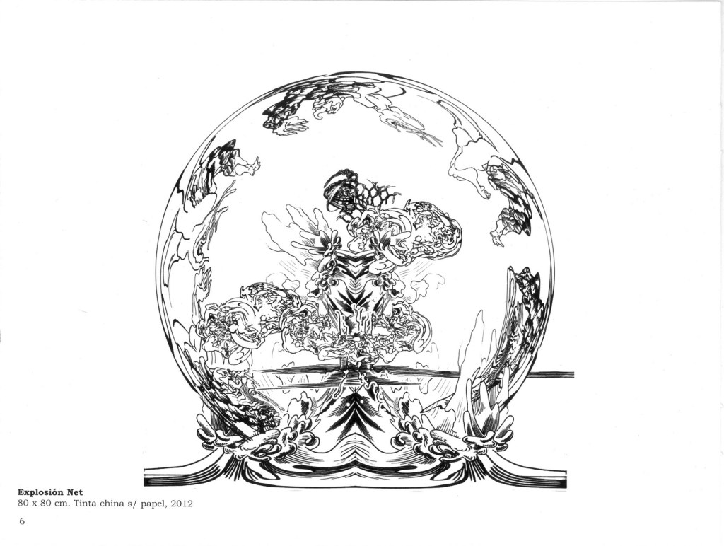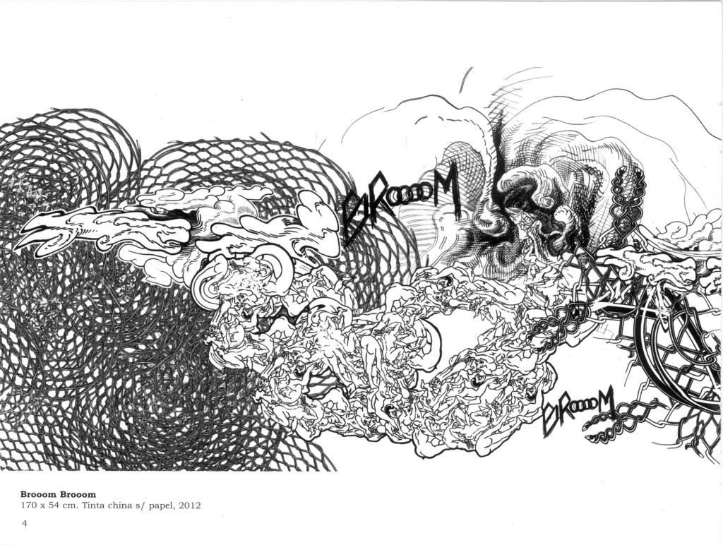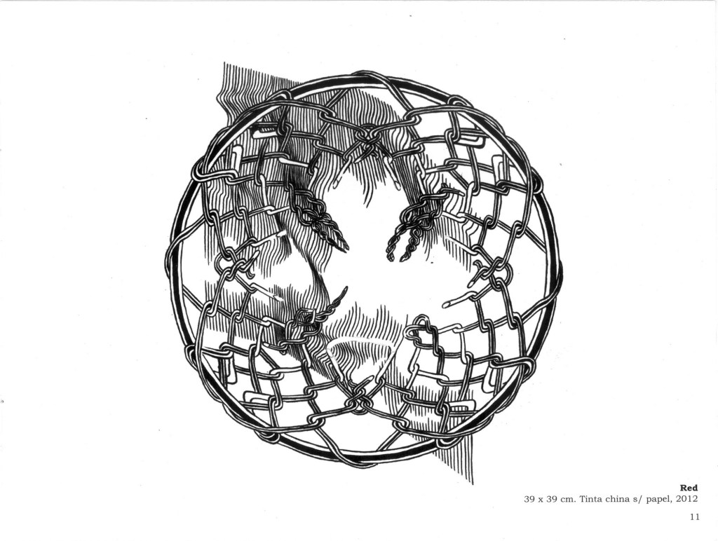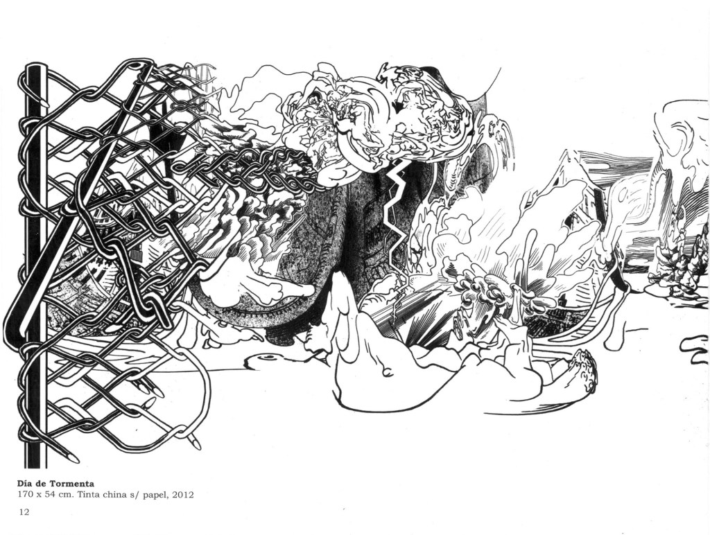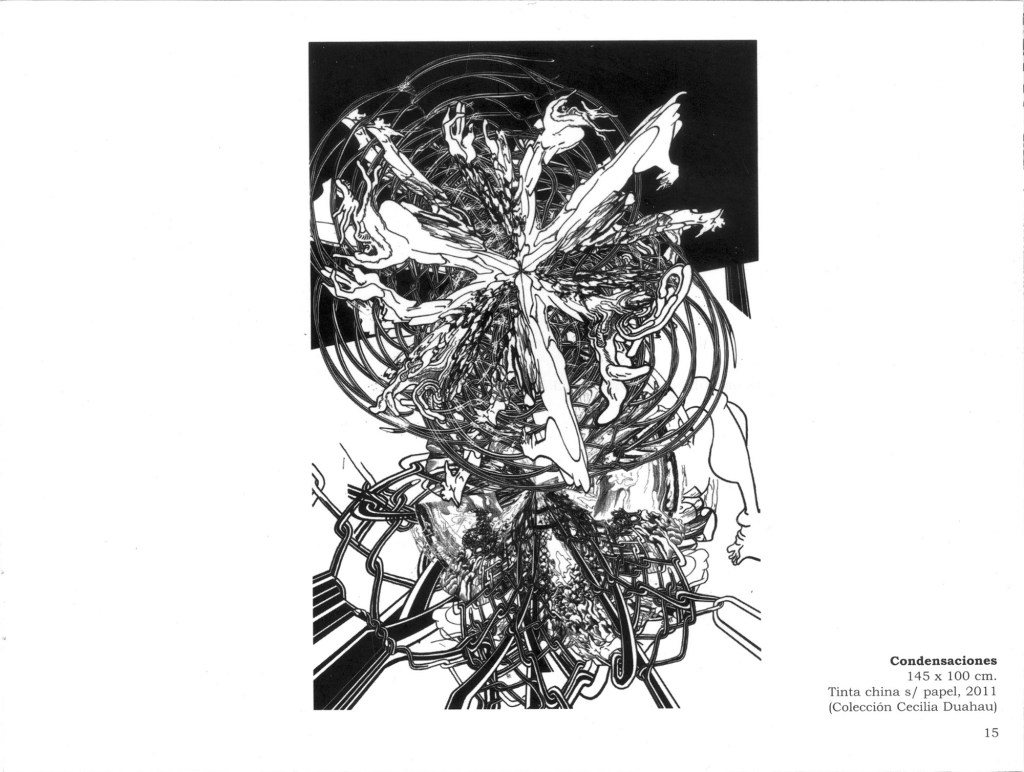 Cuando hablo de madurez en su obra no sólo lo digo por la originalidad del planteo sino porqué combina todas sus experiencias como diseñador desde la historieta hasta los procedimientos digitales como gráficos en términos generales añadiendo una visión que ha ido elaborando en este proceso. Refiriéndome concretamente a sus dibujos de tinta china sobre papel creo que son hijos de un enriquecimiento subjetivo digital que ha tenido, y respecto a los confesados como tales son fruto de la experiencia de la mano dibujando, y, sobre todo, de su sorpresa ante el mundo en el que vive. Esta sorpresa la trasladó al espectador.