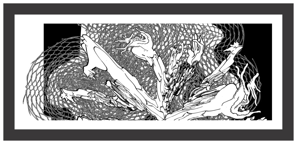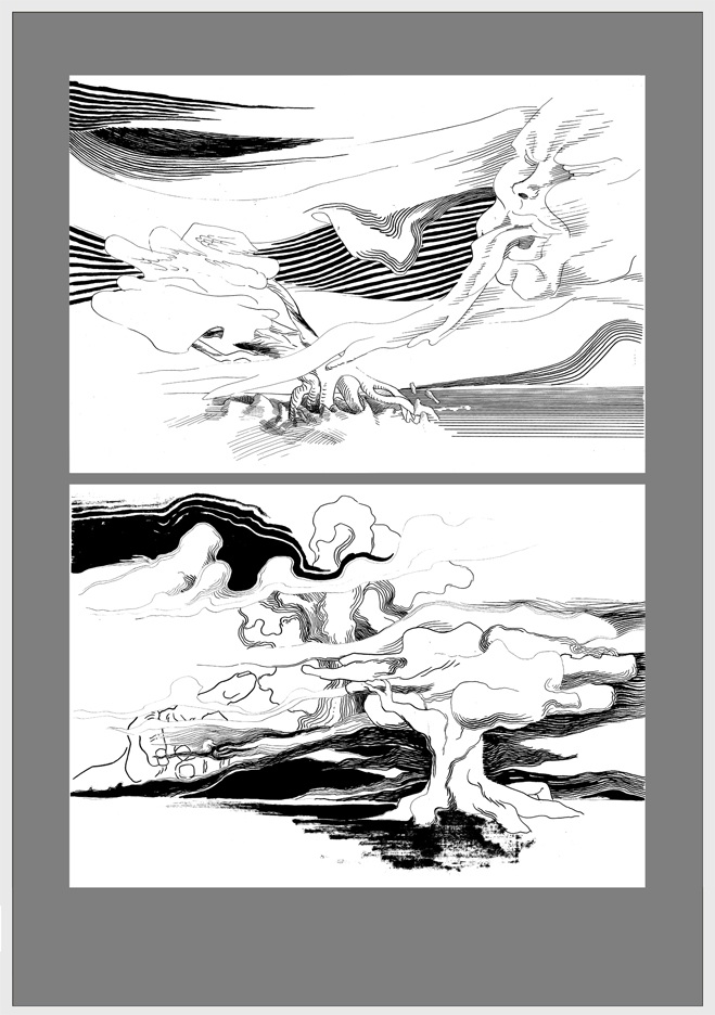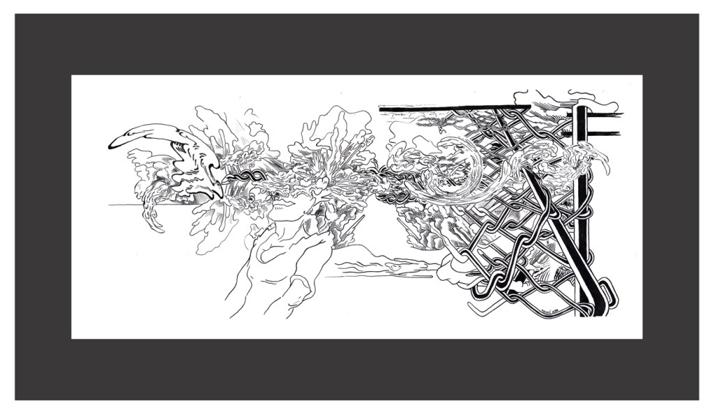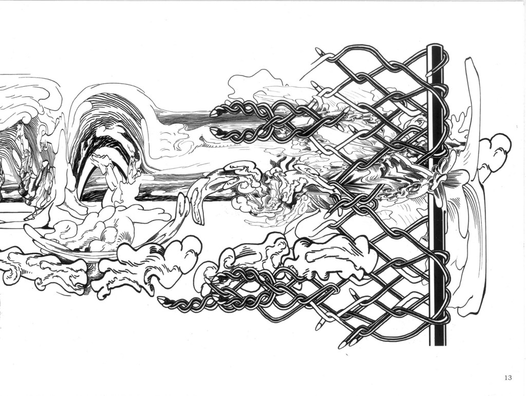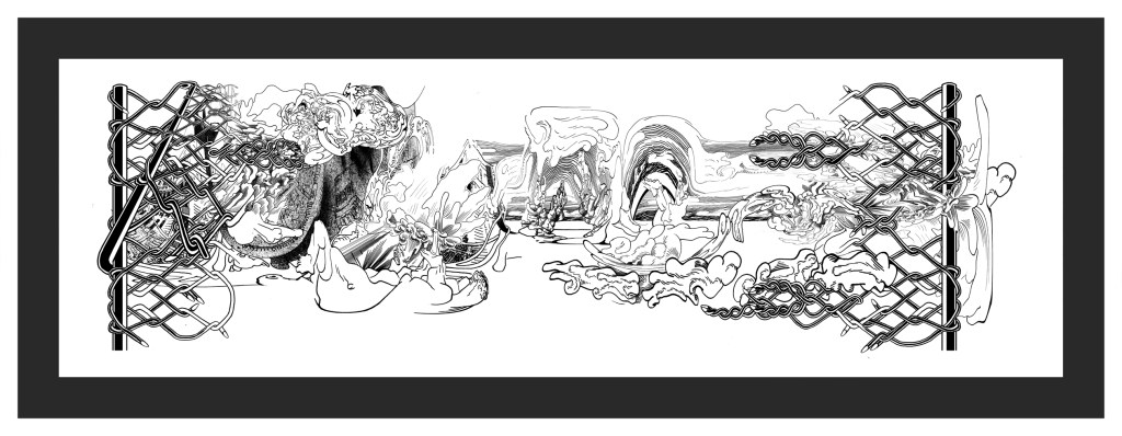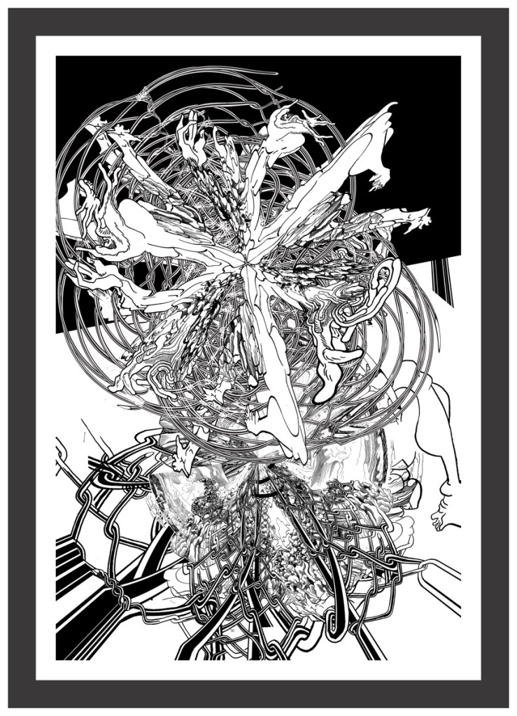Cuando hablo de madurez en su obra no sólo lo digo por la originalidad del planteo sino porqué combina todas sus experiencias como diseñador desde la historieta hasta los procedimientos digitales como gráficos en términos generales añadiendo una visión que ha ido elaborando en este proceso. Refiriéndome concretamente a sus dibujos de tinta china sobre papel creo que son hijos de un enriquecimiento subjetivo digital que ha tenido, y respecto a los confesados como tales son fruto de la experiencia de la mano dibujando, y, sobre todo, de su sorpresa ante el mundo en el que vive. Esta sorpresa la trasladó al espectador.