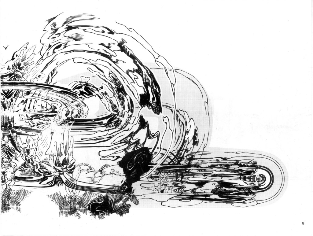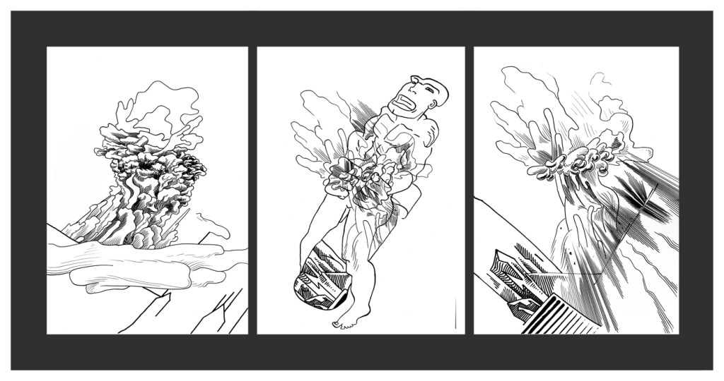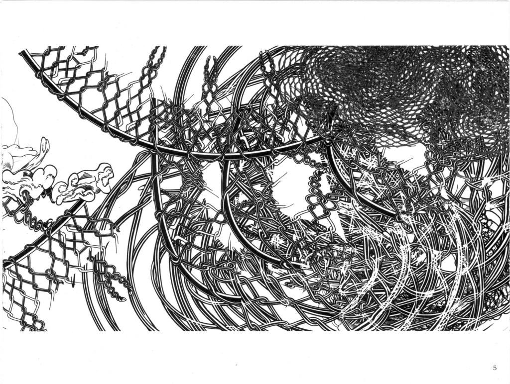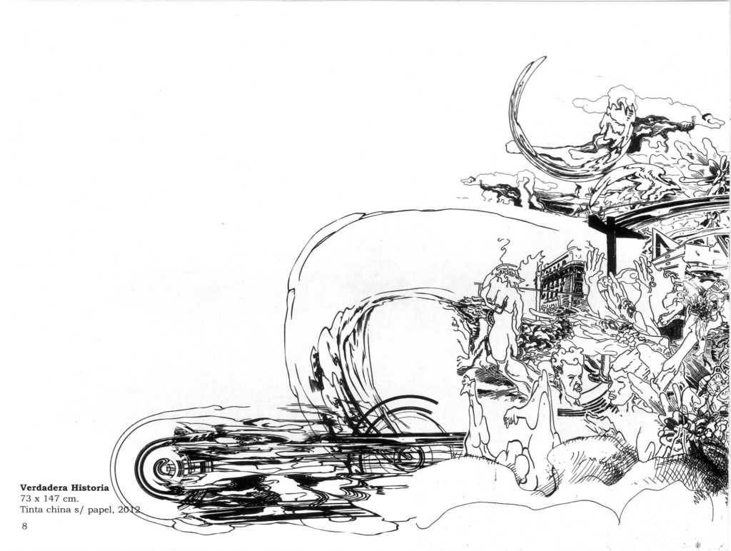 Esta novela interior en la que yo describía dibujando los personajes subjetivos era de por sí para muchos de difícil comprensión, por lo tanto le propuse a Nahuel muchos años después, hacer una nueva versión al estilo comic. Y trabajamos juntos de una manera muy bien sincronizada. Pero ha pasado el tiempo y me encuentro ahora con un Nahuel a quien descubro por primera vez. Viendo su excelente obra actual me viene a la memoria que estábamos trabajando juntos en la mañana del 11 de septiembre de 2001 y vimos por la televisión simultáneamente al instante en el que estaba ocurriendo la caída de la segunda Torre Gemela. Naturalmente nos impresionó mucho. Veo ahora sus dibujos, donde todo se derrumba y al mismo tiempo se reconstruye, se rompe, se entrelaza, en una danza del destino que tiene mucho que ver con mi idea del caos, término que no defino como desorden sino como permutación permanente e imprevisible. En tal sentido creo que este tema asumirlo y encararlo es el gran desafío para los artistas del siglo XXI y me sorprende, por ello mismo, la manera muy precisa y personal en la que Nahuel lo encara.
