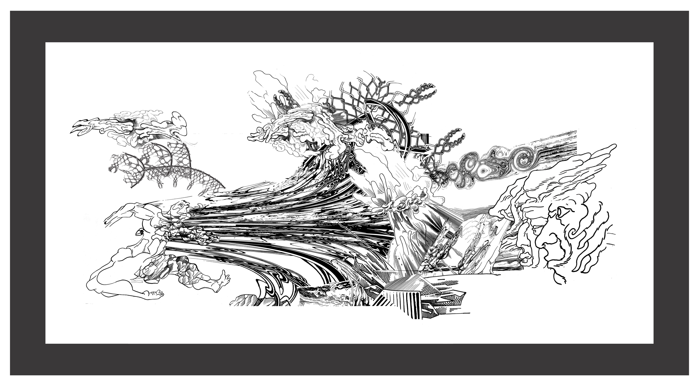Esta novela interior en la que yo describía dibujando los personajes subjetivos era de por sí para muchos de difícil comprensión, por lo tanto le propuse a Nahuel muchos años después, hacer una nueva versión al estilo comic. Y trabajamos juntos de una manera muy bien sincronizada. Pero ha pasado el tiempo y me encuentro ahora con un Nahuel a quien descubro por primera vez. Viendo su excelente obra actual me viene a la memoria que estábamos trabajando juntos en la mañana del 11 de septiembre de 2001 y vimos por la televisión simultáneamente al instante en el que estaba ocurriendo la caída de la segunda Torre Gemela. Naturalmente nos impresionó mucho. Veo ahora sus dibujos, donde todo se derrumba y al mismo tiempo se reconstruye, se rompe, se entrelaza, en una danza del destino que tiene mucho que ver con mi idea del caos, término que no defino como desorden sino como permutación permanente e imprevisible. En tal sentido creo que este tema asumirlo y encararlo es el gran desafío para los artistas del siglo XXI y me sorprende, por ello mismo, la manera muy precisa y personal en la que Nahuel lo encara.
